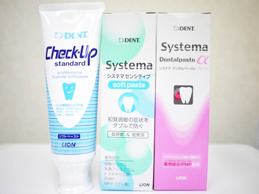 低発砲・低研磨・低香味なので長時間のブラッシングが可能です。フッ素配合で虫歯の発生と進行を予防します。また、殺菌成分や知覚過敏を抑制をするタイプもございます。